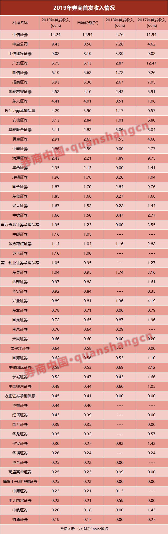 2019年IPO收入的最大赢家是中信证券,独揽14.24亿元的首发收入,占据12.94%市场份额;中金公司、中信建投证券首发收入均超9亿元,排名二、三;广发证券、国信证券首发收入均超6亿元,跻身前五。