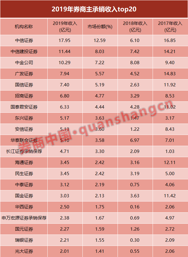 2019年,全行业共获得142.52亿元的主承销收入,较2018年的83.3亿元增加七成。其中,中信证券以17.95亿元的主承销收入排名第一,占据12.59%的市场份额;中信建投证券、中金公司主承销收入排名二、三,均超10亿元。