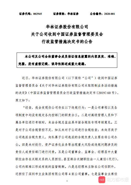 根据证监会2019年1月4日的决定书显示,证监会列举了华林证券的“七宗罪”:一是公司章程以及各项制度中均没有规定各内控部门的职责分工。二是对高级管理人员和下属各单位进行考核时,未由合规总监出具书面合规性专项考核意见。三是对子公司合规管控不足,如从未对子公司进行合规检查;未向另类子公司选派合规负责人,向私募子公司选派的合规负责人主要在母公司办公。四是未对投行、资产证券化业务等出现重大风险或违规问题涉及的责任人或责任部门进行问责。五是公司董事会、监事会、经理层中大量职位由存在关联关系的人员担任,甚至部分关键职位由一人兼任(代行),公司内部难以形成有效的监督制衡。六是总经理林立除在公司任职外,还担任了深圳市立业集团有限公司等4家公司董事。七是监事会主席任职不符合《公司章程》第一百九十五条的规定、公司董事会授权不明确等。