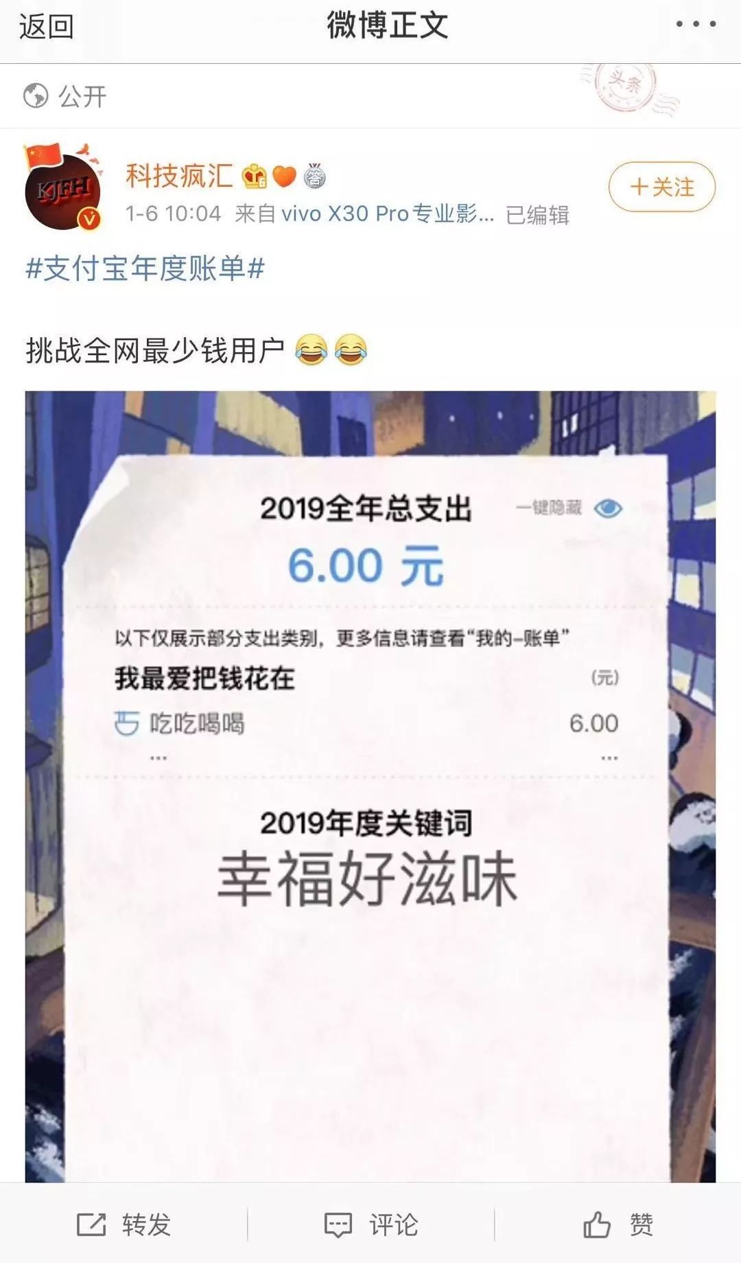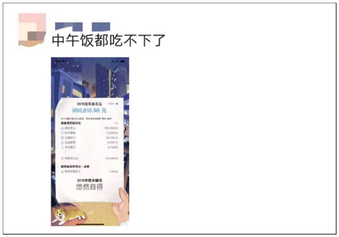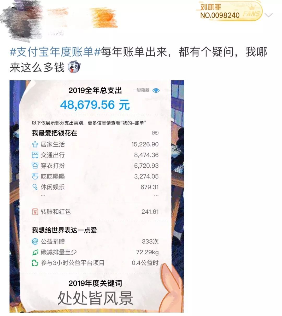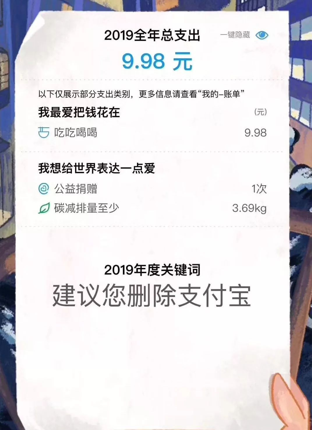对于大家的这些疑问,蚂蚁金服方面称,今年支付宝年账单没有总消费的概念,全部调整为总支出了。具体来说,比去年增加投资理财、金融保险、人情往来、公益慈善、转账充值这几个版块,因此大家看到的年度总支出金额,可能会偏高点。支付宝不是只有花钱,其实是在帮大家管钱。也就是说,大家看到的账单不是只计算消费方面的支出,你在支付宝上买的基金保险,你的信用卡还款,你往自己银行卡的转账......都计算在其中,哪怕很多时候是“左手转右手”。而且,购物退款也不会显示在账单里。这些因素都导致支付宝账单显示的数据与大家感觉的实际支出有很大误差。所以,敢不敢晒出你的账单!小编先来