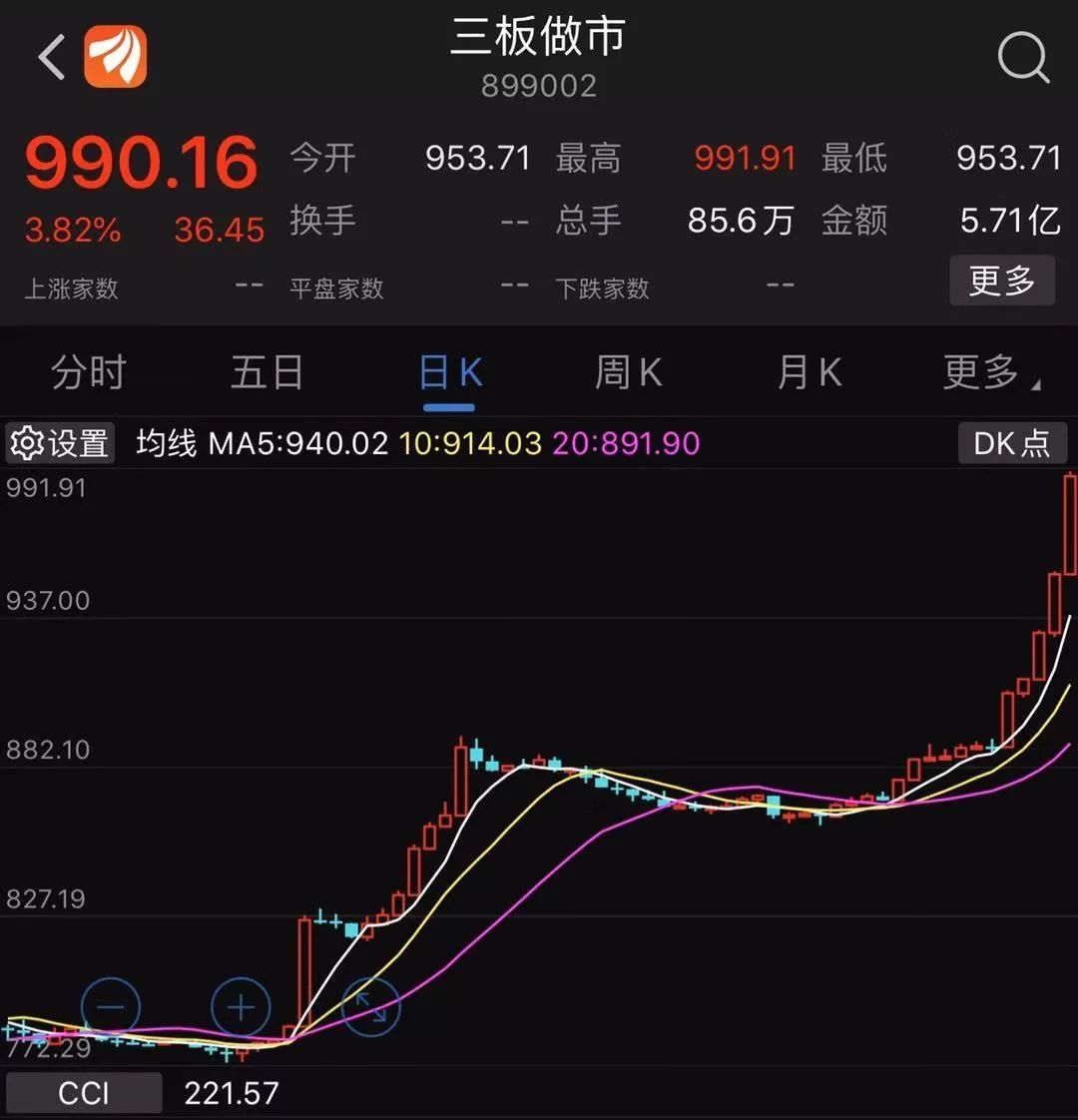 在各项利好影响下,三板指数继续疯狂上涨,月线已经录得7连阳!1月6日,三板指数大涨3.82%,个股方面,精英智通大涨近34%,博采网络、大泽电极、ST明利、金天地、中喜股份、超毅网络等11股大涨超过20%。