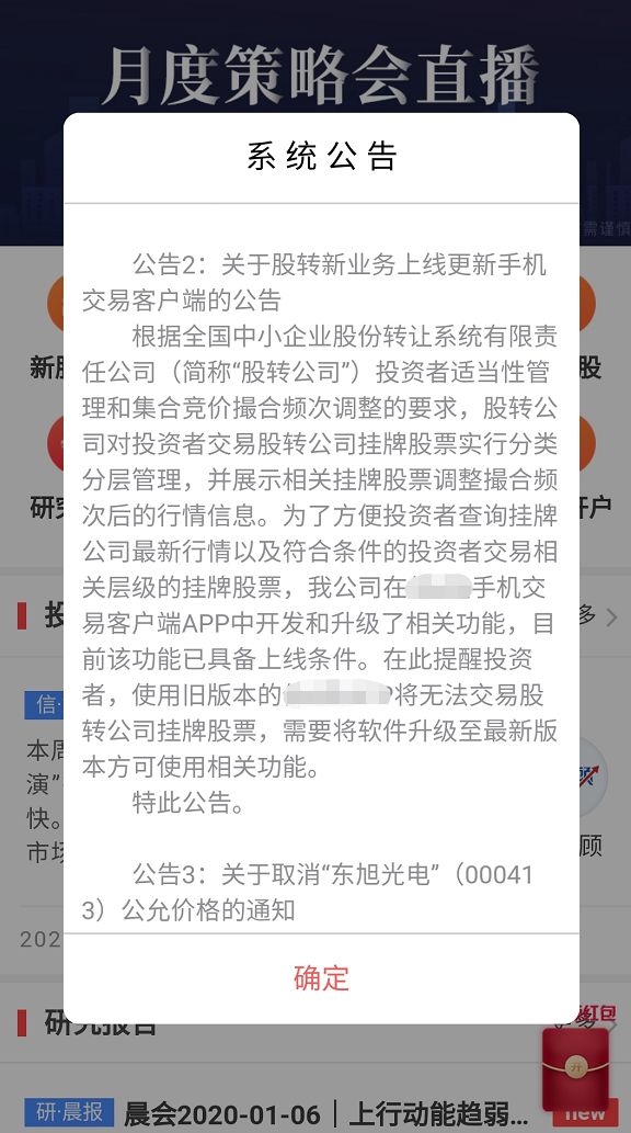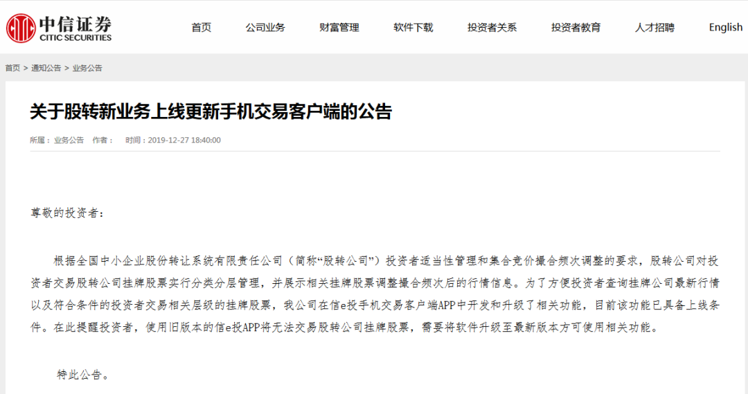 对此,该券商客服人员回应称,该公告主要是针对股转公司的分层调整政策进行的软件升级,目前尚不具备在APP内直接开通新三板业务的功能,还是需要到营业部临柜办理。在权限开通后,即可在APP内实现相关交易功能。