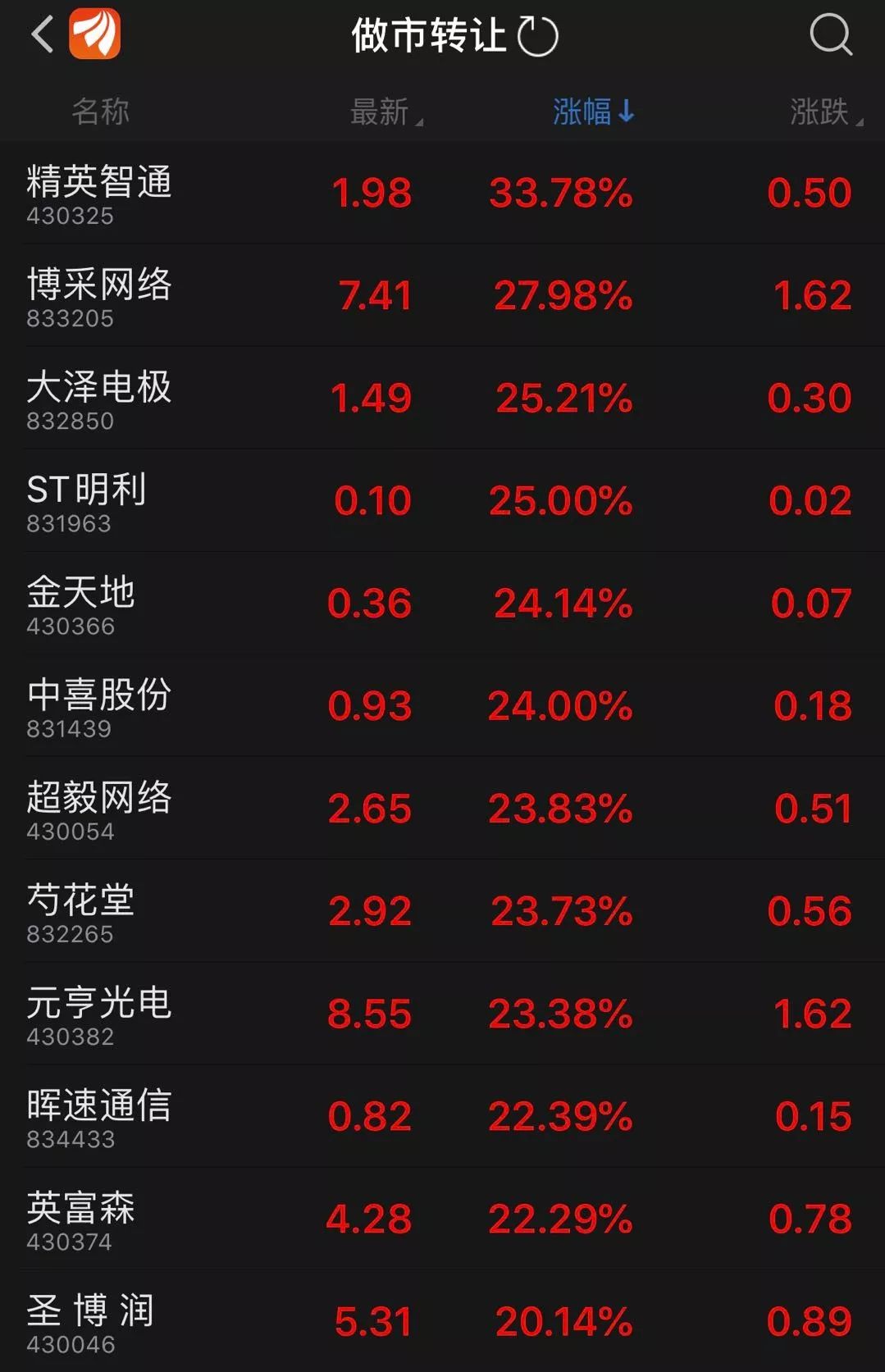 在各项利好影响下,三板指数继续疯狂上涨。1月6日,三板指数大涨3.82%,个股方面,精英智通大涨近34%,博采网络、大泽电极、ST明利、金天地、中喜股份、超毅网络等11股大涨超过20%。