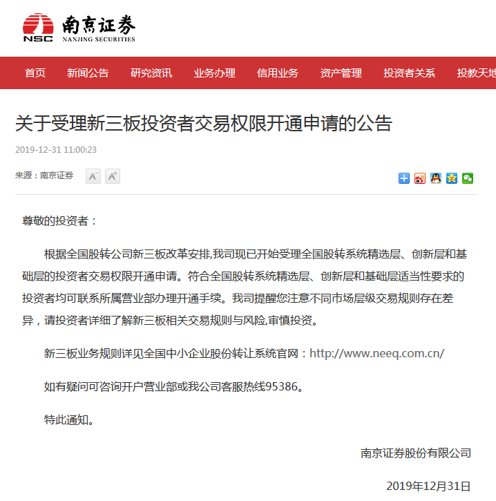在政策的充分保障下,各家券商多已开启了业务上线及宣传工作,在官网、官微等处挂出公告,称已开始受理全国股转系统精选层、创新层和基础层的投资者交易权限开通申请。