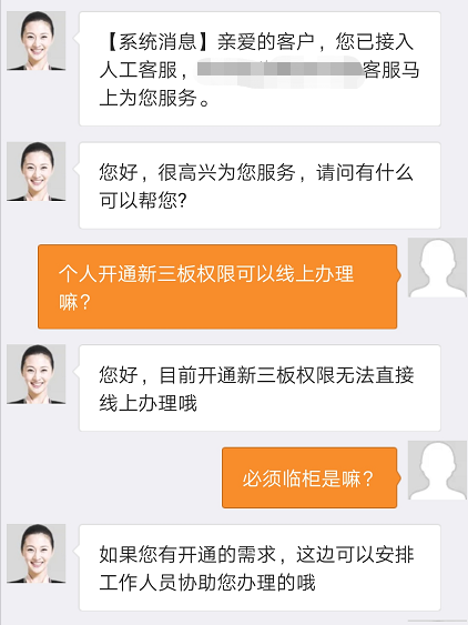 另外,同样有头部券商APP在线客服表示,目前开通新三板权限无法直接线上办理,建议客户通过临柜或见证方式进行。由于股转系统升级,目前暂无法无法开通新三板权限。此外,在线客户还主动提示称,“交易新三板股票属于中高风险业务”,并提供自然人投资者开通新三板业务的相关条件。