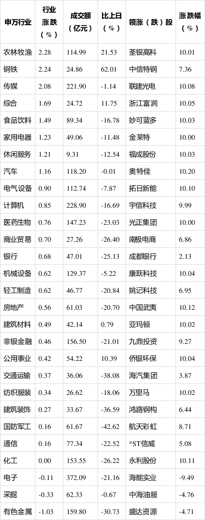 证券时报•数据宝统计,截至上午10:24,今日沪指涨幅0.47%,A股成交量259.39亿股,成交金额2688.68亿元,比上一个交易日减16.49%。个股方面,2586只个股上涨,其中非ST股涨停40只,912只个股下跌从申万行业来看,农林牧渔、钢铁、传媒等涨幅最大,涨幅分别为2.28%、2.24%、2.08%;有色金属、采掘、电子等跌幅最大,跌幅分别为1.03%、0.33%、0.11%。(数据宝)