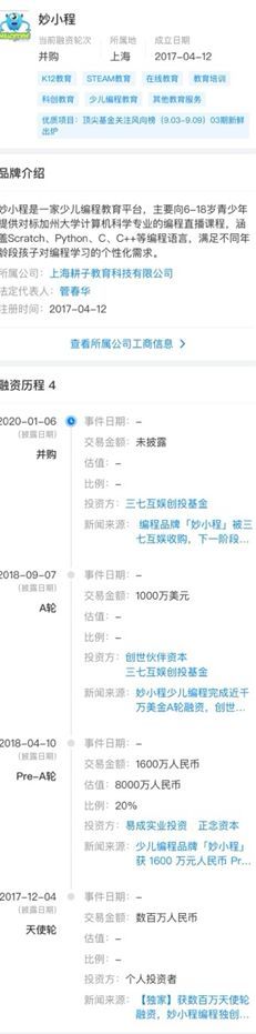 1月6日,少儿编程公司妙小程宣布正式被游戏公司三七互娱收购,双方达成战略合作关系。据称,目前收购程序已经进入尾声。