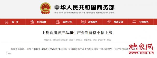 据商务部监测,上周(2019年12月30日至2020年1月5日)全国食用农产品市场价格比前一周上涨0.9%,生产资料市场价格比前一周上涨0.3%。