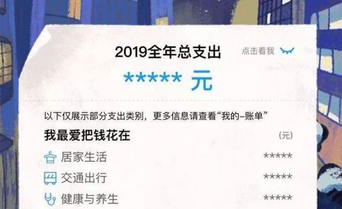 年度账单用“我和支付宝走过了xxx天”“我在xxxx上花费了xxx元”“光顾了xx个老板的生意支付了xx次”“用支付宝办事少跑xx趟”以及走了多少路、种了多少树、喂了多少鸡这些看上去“不太重要”的事情作为铺垫,悬念保留到最后的,则是最让人感到意外的——“2019全年总支出”。