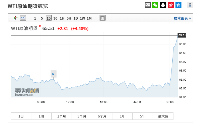 受消息影响,截至北京时间8:20左右,国际油价持续走高,WTI原油涨超4%,升破65美元/桶关口。