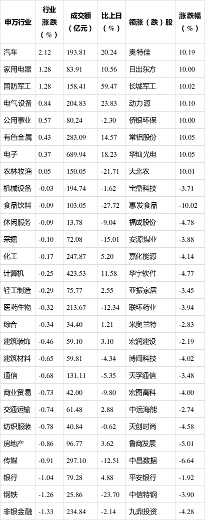 证券时报•数据宝统计,截至上午收盘,今日沪指涨幅-0.52%,A股成交量430.11亿股,成交金额4351.36亿元,比上一个交易日增5.69%。个股方面,1246只个股上涨,其中非ST股涨停45只,2300只个股下跌从申万行业来看,汽车、家用电器、国防军工等涨幅最大,涨幅分别为2.12%、1.28%、1.28%;非银金融、钢铁、银行等跌幅最大,跌幅分别为1.33%、1.26%、1.04%。(数据宝)