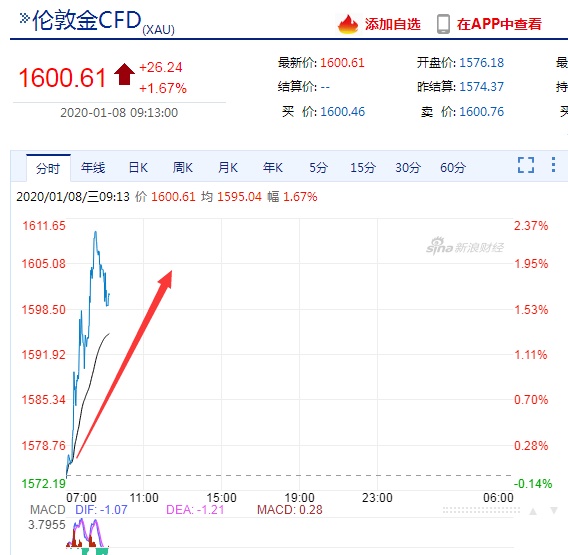 现货黄金早盘持续攀升,最高升至1611.42美元/盎司,涨幅扩大至1.6%,刷新7年新高。