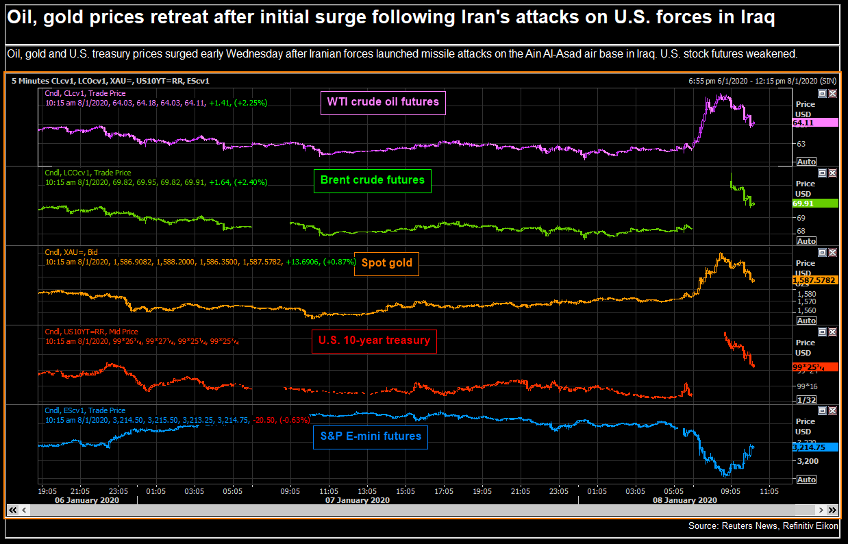 当地时间8日凌晨,伊朗向驻伊拉克美军发射火箭弹,引发了中东冲突升级和原油供应中断的担忧,股市、汇市和黄金市场也受到了袭击的影响。但据路透社最新消息,随着担忧消退,目前的国际油价应声开始回落,已远低于今日早盘时触及的峰值。