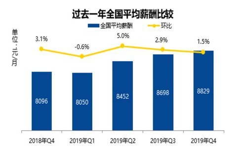 智联招聘2019年4季度在线数据显示,全国38个主要城市的平均招聘薪酬为8829元/月,本季度平均薪酬绝对值环比上升1.5%,同比涨幅为9.1%。