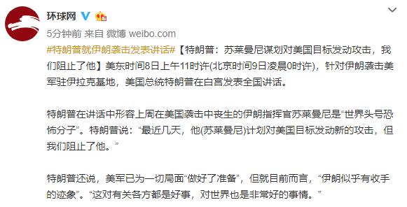 特朗普在讲话中形容上周在美国袭击中丧生的伊朗指挥官苏莱曼尼是“世界头号恐怖分子”。特朗普说:“最近几天,他(苏莱曼尼)计划对美国目标发动新的攻击,但我们阻止了他。”