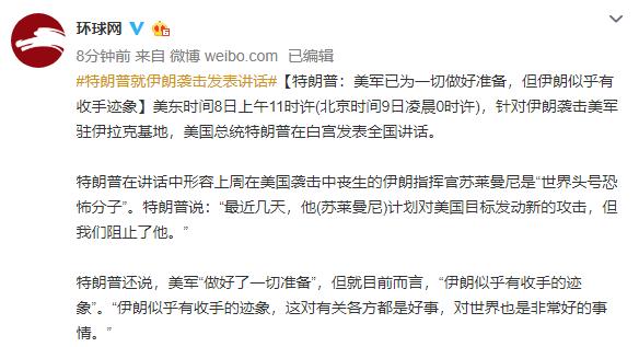 特朗普还说,美军“做好了一切准备”,但就目前而言,“伊朗似乎有收手的迹象”。“伊朗似乎有收手的迹象,这对有关各方都是好事,对世界也是非常好的事情。”