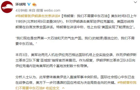 特朗普在讲话中称,他上台后“美国实现了能源独立”。“我们现在是世界第一大石油和天然气生产国。我们(的能源)是独立的,我们不需要中东石油。”
