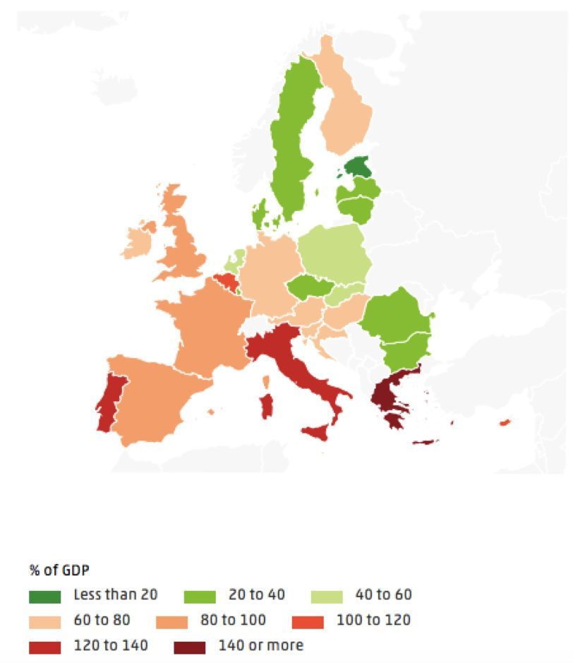 显而易见的是,欧洲南部的欧元区国家债务水平较高,而像斯堪的纳维亚和一些欧元区以外的东欧欧盟国家,则因保留了本币,而得以将债务维持在低于欧元区的水平。