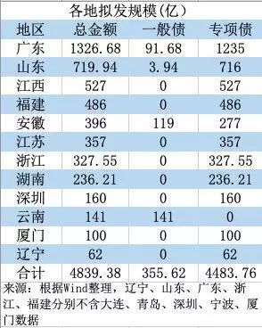 分地区来看,本周拟发行的4839.38亿地方债分布在广东、山东、江西、福建等地区,其中广东发行最多为1326.68亿,其次为山东的719.94亿。