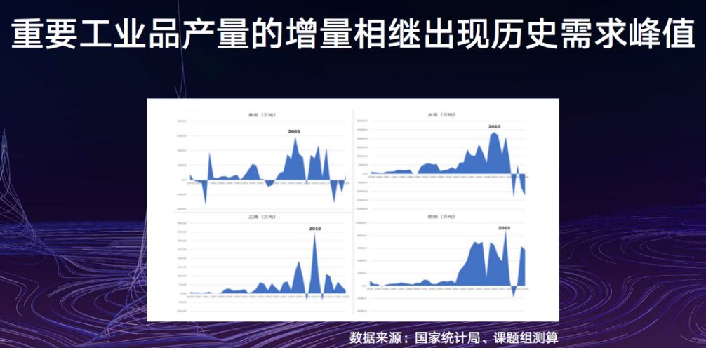 第一,工业化阶段的重要历史需求峰值相继出现。所谓“历史需求峰值”,是指整个工业化、城市化发展长达几十年或者上百年历史进程中,重要产品的生产和需求量最大或增速最高的点或区间。