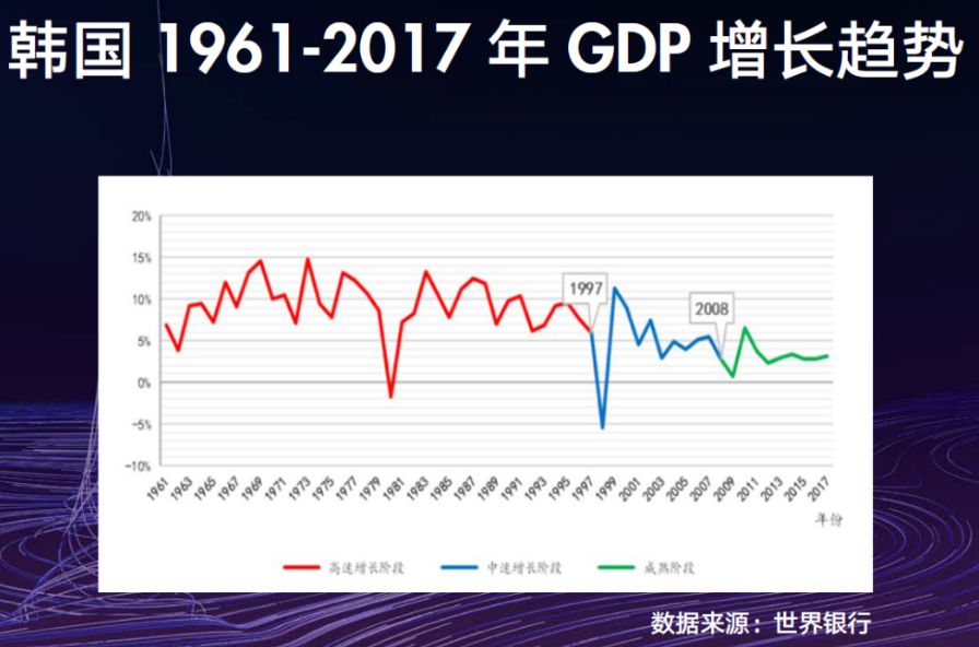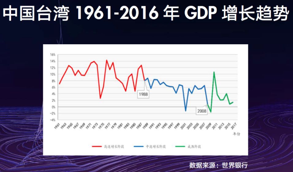 日本经济在20世纪五六十年代曾经维持9%的增速,到了70年代初期由高速转入中速,直接降为4%。韩国的变化发生在90年代中后期,由10%降到5%左右。中国台湾在20世纪80年代后期也发生了这样的变化,从10%左右降到5%-6%。台湾增长减速时期的增速相对较高,是因为当时承接了IT产业发展的战略机遇。