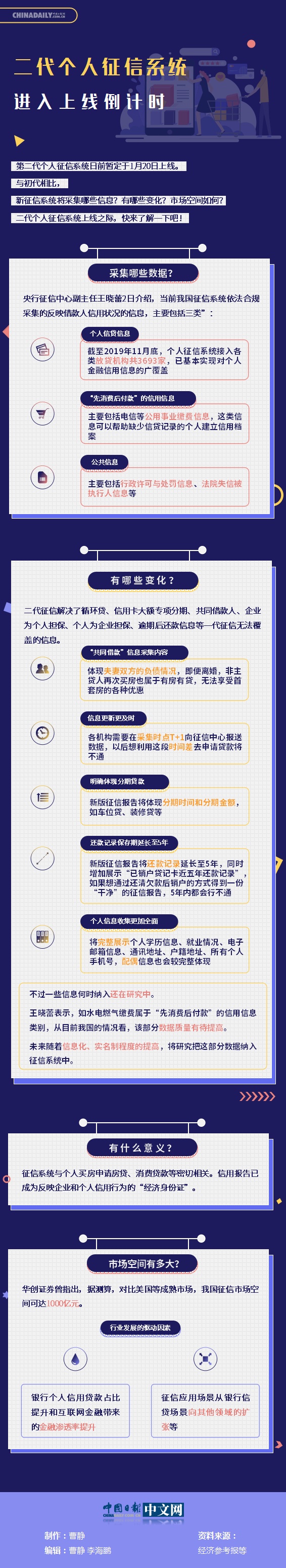 中国日报网1月15日电(曹静) 第二代个人征信系统日前暂定于1月20日上线。与初代相比,新征信系统将采集哪些信息?有哪些变化?市场空间如何?二代个人征信系统上线之际,快来了解一下吧!