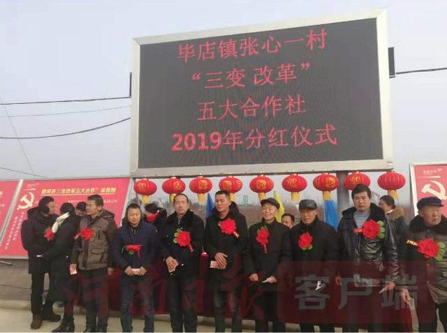 1月18日,在南阳市唐河县毕店镇张心一村的广场上,村民胸带红花,喜气洋洋。随着主持人一声令下,该村“三变”改革五大合作社2019年分红仪式正式开始。