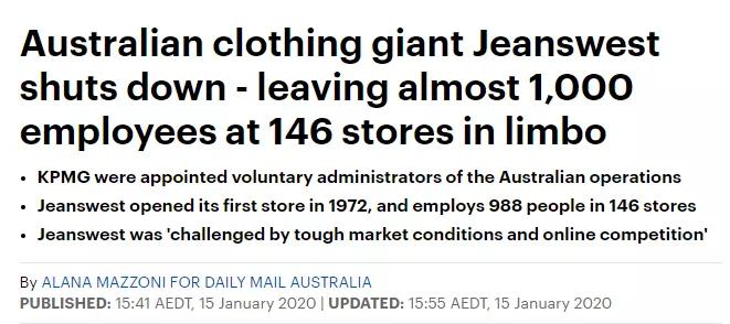 全球零售业的寒风,又刮倒了一位服装业巨头!曾经的服装品牌巨头——真维斯(JeansWest)澳大利亚公司面临破产。这家一度火爆全球、以制造牛仔裤为主的服装大牌,走入了暮色苍茫。