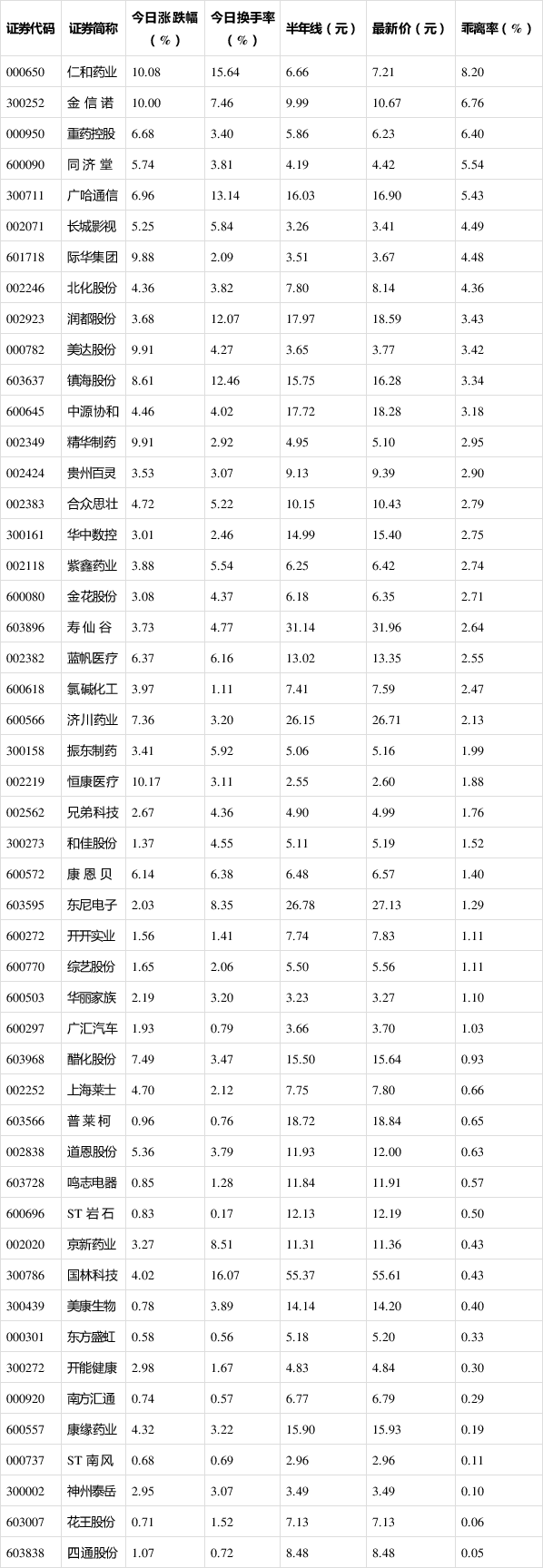 证券时报•数据宝统计,截至今日下午收盘,上证综指3052.14点,收于半年线之上,涨跌幅-1.41%,A股总成交额为6532.83亿元。到目前为止今日有49只A股价格突破了半年线,其中乖离率较大的个股有仁和药业、金信诺、重药控股等,乖离率分别为8.20%、6.76%、6.40%;四通股份、花王股份、神州泰岳等个股乖离率小,刚刚站上半年线。