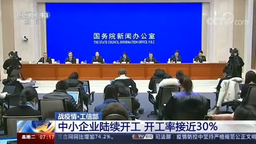 工信部表示,目前,重点医疗物资保障企业复工复产率较高,湖北一线医护人员所需要的重点医疗物资得到了基本保障。中小企业陆续开工,开工率接近30%。