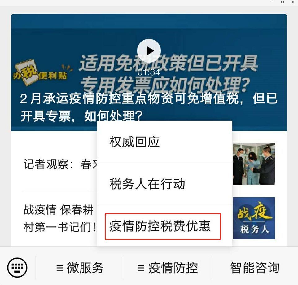 方式一:关注“国家税务总局微信公众号”,点击菜单“疫情防控——疫情防控税费优惠”查看。