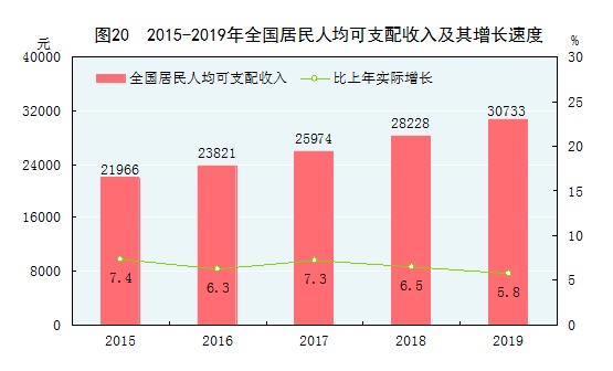 【环球网 记者 刘艺】2月28日,国家统计局发布2019年国民经济和社会发展统计公报。数据显示,在居民收入消费方面,全年全国居民人均可支配收入30733元,比上年增长8.9%,全年全国居民人均消费支出21559元,比上年增长8.6%。