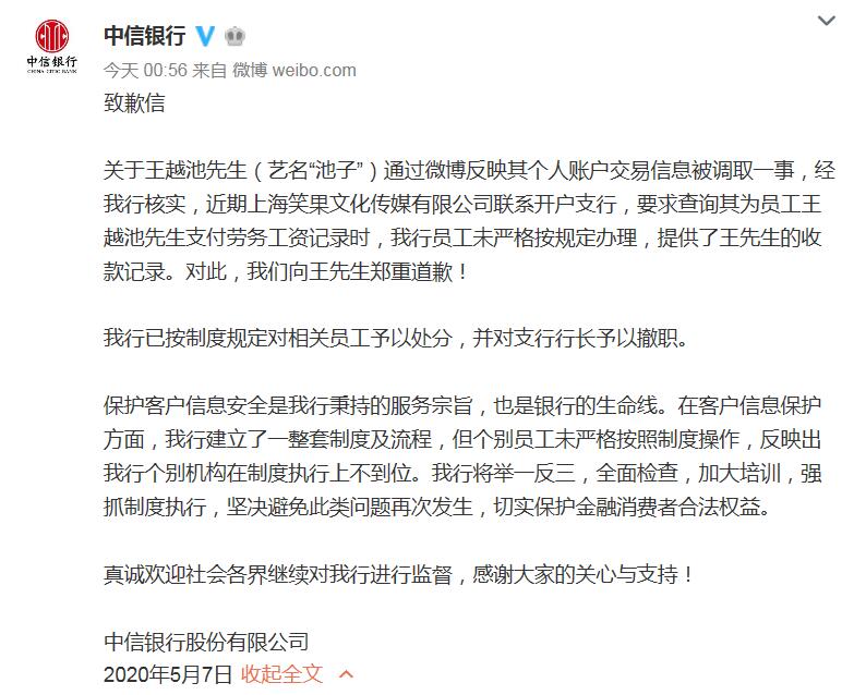 中信银行表示,关于王越池先生(艺名“池子”)通过微博反映其个人账户交易信息被调取一事,经我行核实,近期上海笑果文化传媒有限公司联系开户支行,要求查询其为员工王越池先生支付劳务工资记录时,我行员工未严格按规定办理,提供了王先生的收款记录。对此,我们向王先生郑重道歉!我行已按制度规定对相关员工予以处分,并对支行行长予以撤职。