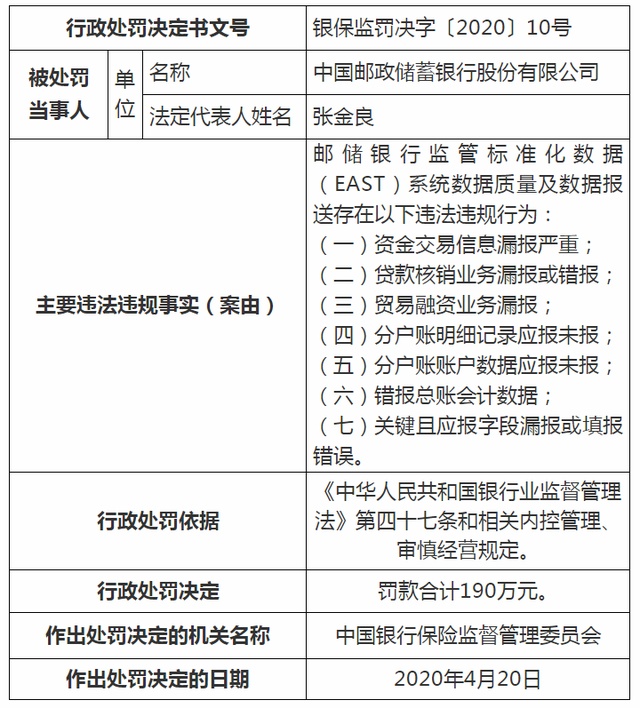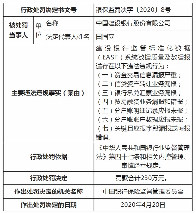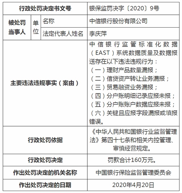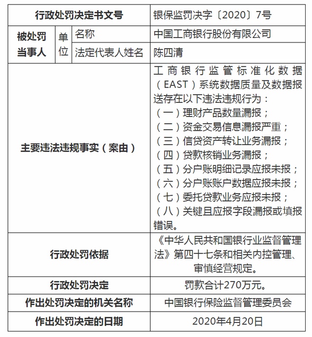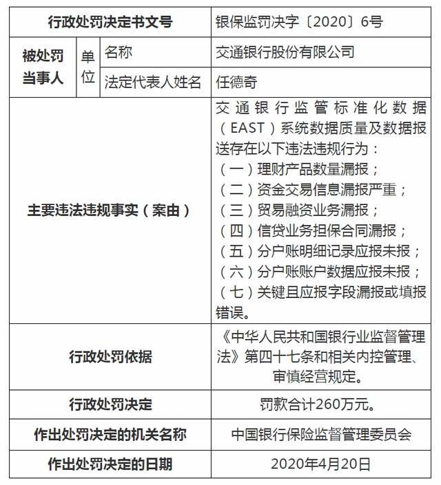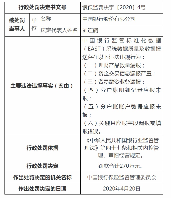 其中,中国银行股份有限公司因存在理财产品数量漏报;资金交易信息漏报严重;贸易融资业务漏报;分户账明细记录应报未报;分户账账户数据应报未报;关键且应报字段漏报或填报错误的行为,被罚款合计270万元。