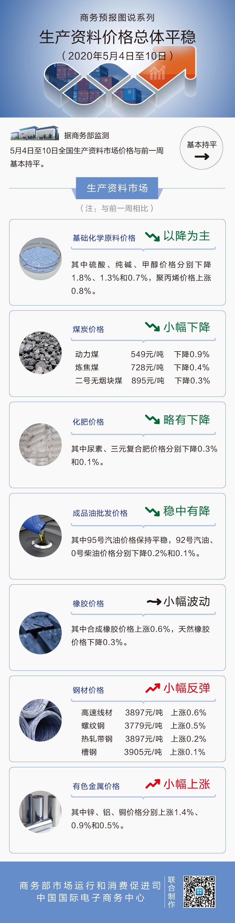 生产资料市场:基础化学原料价格以降为主,其中硫酸、纯碱、甲醇价格分别下降1.8%、1.3%和0.7%,聚丙烯价格上涨0.8%。煤炭价格小幅下降,其中动力煤、炼焦煤、二号无烟块煤价格分别为每吨549元、728元和895元,分别下降0.9%、0.4%和0.3%。化肥价格略有下降,其中尿素、三元复合肥价格分别下降0.3%和0.1%。成品油批发价稳中有降,其中95号汽油价格保持平稳,92号汽油、0号柴油价格分别下降0.2%和0.1%。橡胶价格小幅波动,其中合成橡胶价格上涨0.6%,天然橡胶价格下降0.3%。钢材价格小幅反弹,其中高速线材、螺纹钢、热轧带钢和槽钢价格分别为每吨3897元、3779元、3897元和3905元,分别上涨0.6%、0.5%、0.2%和0.1%。有色金属价格小幅上涨,其中锌、铝、铜价格分别上涨1.4%、0.9%和0.5%。