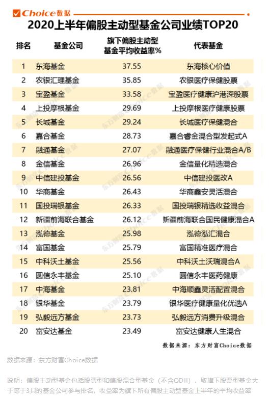 2020年上半年,全球资本市场动荡,A股市场依旧结构性分化,韧性十足,公募基金凭借专业投研优势再现赚钱效应。根据Wind数据统计,今年上半年沪深300指数涨幅仅为1.64%,而同期共有1655只基金净值增长率超过20%,其中权益投资能力较强的基金公司表现更为抢眼。股票型基金收益率最高,为22.36%,而同期上证指数跌幅2.15%。其次是混合型基金,16.51%。指数型、QDII基金相较于一季度业绩也大幅上扬。短期理财型基金超越货币市场基金,平均收益率1.14%。个基方面,业绩最好的基金为创金合信医疗保健股票A,上半年年收益率达到83.17%,投资类型为股票型。混合型基金第一名为融通医疗保健行业混合A/B,上半年收益率73.68%;债券型基金第一名为金信民旺债券A,收益率18.83%;QDII基金第一名为上投摩根中国生物医药混合(QDII),上半年收益率62.88%;指数型基金第一名为招商国证生物医药指数分级,上半年年收益率达到66.03%。
