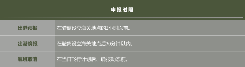 航空器负责人在进境航空器预计抵达境内第一目的港当日零时前或出境航空器预计驶离出发港当日零时前,以电子数据形式向海关申报运输工具动态。