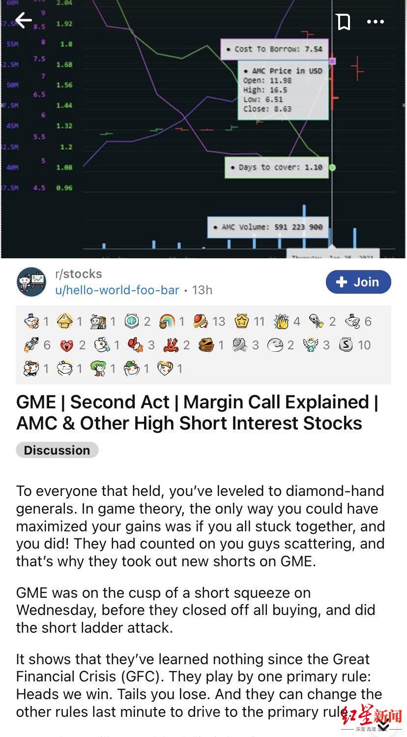 尼科莱这样的观点在散户中大有人在。Reddit上的美国“华尔街赌徒”聊天室内,29日,有人发布了一封公开信,斥责以梅尔文资本(Melvin Capital)为代表的华尔街机构,称他们在2008年的金融危机中给数以百万的普通民众带来莫大苦难,却没有受到惩罚,反而得到救助。如今,这些大佬又公然非法做空GameStop这样的股票,企图市场操纵,旧技俩重施,丝毫没有吸取教训。
