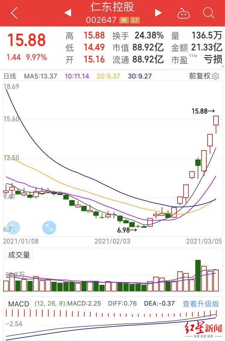3月5日仁东控股再度强势涨停,截至收盘,股价报收15.88元,较春节前的最低谷不到7元已实现翻倍。这也是仁东控股短短8个交易日内的第7个涨停,该股自春节以后持续大涨,短期内涨幅之大令人瞠目结舌。