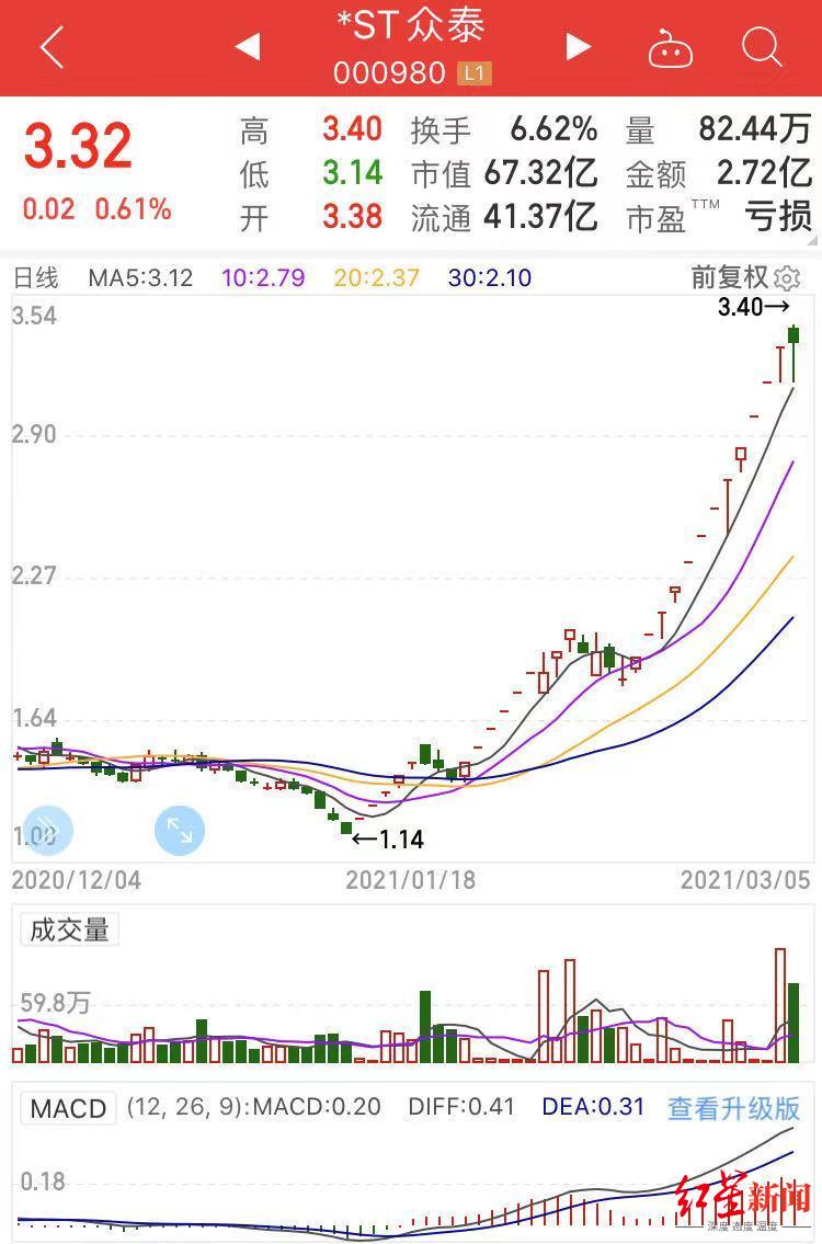 事实上从今年2月以来,ST板块就悄然“乌鸦变凤凰”,呈现连续上涨的态势。其中*ST众泰2月以来的涨幅近80%,一度上演12连板成为“妖股”。如果从今年1月算起,*ST众泰的股价从每股最低的1.14元,涨至3月5日的3.4元,涨幅已近3倍,成为牛年春节以来涨幅最大的股票之一。