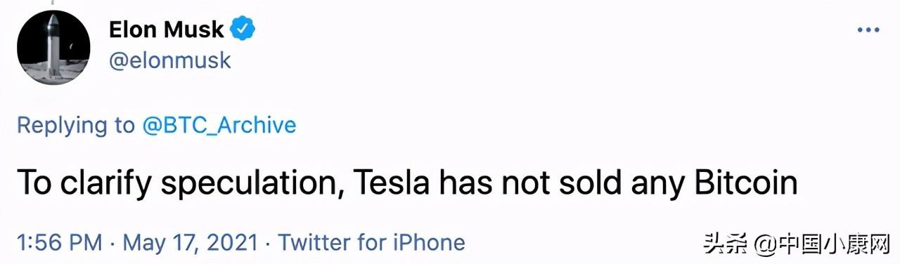中国小康网讯 当地时间5月17日,特斯拉CEO埃隆·马斯克澄清称,特斯拉没有出售任何比特币。此前,有推特用户向马斯克留言称,“如果发现特斯拉已经抛售了剩余的比特币持仓,比特币人士(持有者)下个季度(季度财报公布后)肯定会扇自己一记耳光。”马斯克用“确实(Indeed)”一词回复了这条推文。引发网友热议。