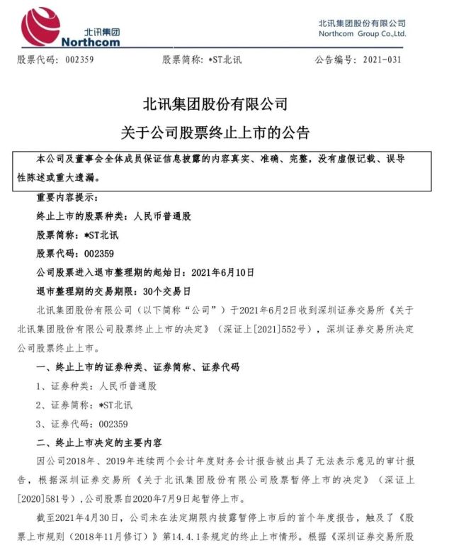 同日晚间,*ST北讯披露即将退市的相关公告。公司公告称,因公司2018年、2019年连续两个会计年度财务会计报告被出具了无法表示意见的审计报告,根据深交所《关于北讯集团股份有限公司股票暂停上市的决定》,公司股票自2020年7月9日起暂停上市。