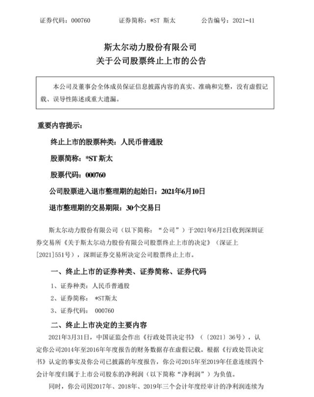 对于*ST斯太,深交所2日晚间发布公告称,按照退市新规过渡期安排,根据相关规定以及本所上市委员会审核意见,深交所决定对*ST斯太实施重大违法强制退市,公司股票终止上市。