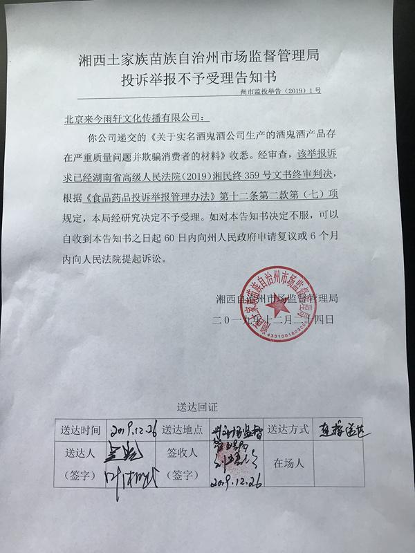 湘西州市场监督管理局的告知书显示,来今雨轩公司递交的酒鬼酒产品存在严重质量问题并欺骗消费者的材料该局已收悉。经审查,该举报诉求已经湖南省高级人民法院(2019)湘民终359号文书终审判决,根据《食品药品投诉举报管理办法》第十二条第二款第(七)项规定,该局经研究决定不予受理。“如对本告知书决定不服,可以自收到本告知书之日起60日内向州人民政府申请复议或6个月内向人民法院提起诉讼。”