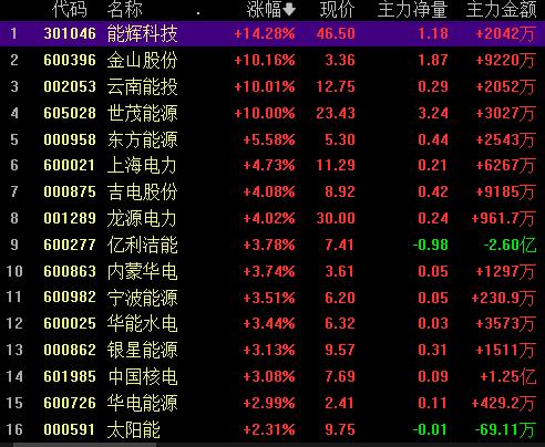 3月9日,绿色电力板块表现亮眼,其整体上涨1.09%,金山股份、云南能投、世茂能源等3只概念股涨停,能辉科技也大涨14.28%,东方能源涨5.58%。