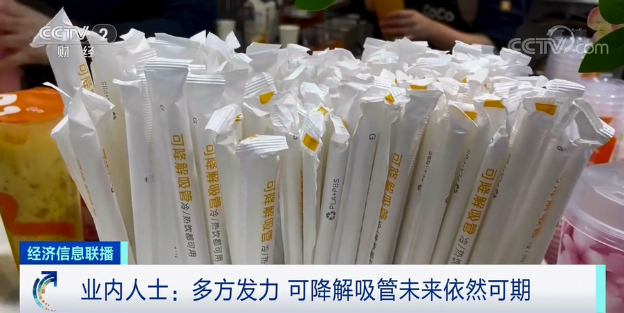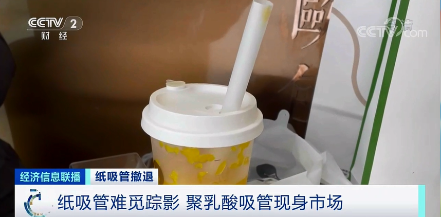 在北京的一家商场,记者走访多家连锁饮品门店发现,曾经风靡的纸吸管,已经很少见到踪影,一种叫作PLA的可降解吸管占据了主流。这些吸管的外包装上标注:PLA吸管也叫聚乳酸吸管,它以玉米、小麦、木薯等植物中提取的淀粉为原料,可以全生物降解。
