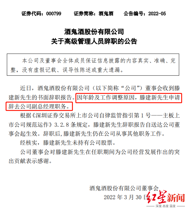 3月30日,酒鬼酒(000799.SZ)发布高级管理人员辞职公告,董事会收到公司副总经理滕建新的书面辞职报告,辞职后仍在公司从事其他职务工作。