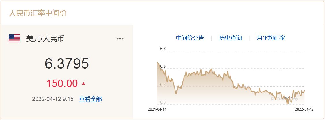 中新经纬4月12日电 12日,据中国外汇交易中心消息,人民币兑美元中间价报6.3795,调贬150个基点。