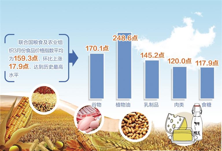 粮农组织2022年3月份食品价格指数平均为159.3点,环比上涨12.6%(17.9点),大幅跃升至该指数自1990年设立以来的最高水平。植物油、谷物和肉类价格指数创下历史新高,而食糖和乳制品的价格指数亦显著上涨。