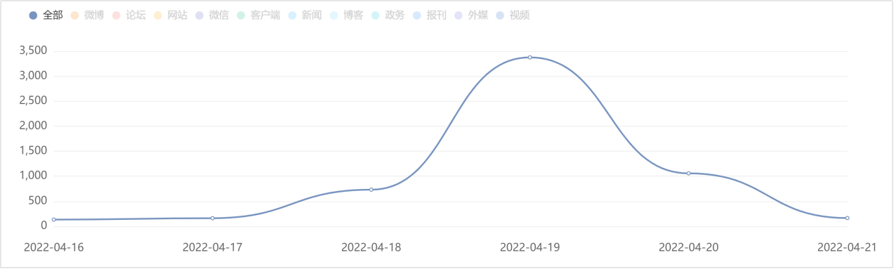 以4月16日0时至4月21日11时为周期,通过中国文化传媒集团舆情系统进行信息检索发现,监测周期内舆情高点出现于4月19日。